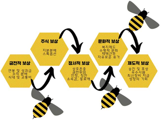 금전적 보상만큼 중요한 것이 문화·제도적 보상이다. 요즘 MZ 세대들은 워라밸(Work and Life Balance)을 중시하고 건강에 관심이 많으며 수평적으로 자유롭게 일하는 것을 좋아한다. 물론 전세자금 대출이나 건강검진, 어린이집 운영 등과 같이 돈이 많이 드는 복지제도는 어느 정도 성장을 많이 한 이후에 해도 늦지 않다. 구글처럼 돈을 벌지도 못하는데 구글 같은 복지를 시행하거나 바라는 것은 문제가 있다고 생각한다. 그 전에는 유연근무제도, 리프레시 휴가, 월요병을 없애기 위한 월요일 오후 출근 등과 같이 돈이 많이 들지 않으면서도 직원들의 만족도를 높일 방법을 찾아 회사의 상황에 따라 조절하면 좋다.