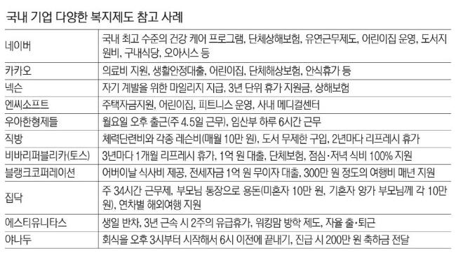 네이버를 비롯해 많은 스타트업에서 시행하고 있는 제도 중에 돈이 들지 않으면서 만족도가 높은 것이 ‘오아시스’라는 제도다. 한 달에 한 번 2시간 늦은 출근이나 2시간 빠른 퇴근을 할 수 있는 것으로 연차와는 무관하고 상사의 결재도 필요 없는 제도다. 살다 보면 개인적인 행정 업무 때문에 은행이나 관공서에 방문할 때도 있고 몸이 안 좋아서 병원에 들르고 싶을 때도 있는데 반차나 연차를 쓰기 아까울 때 아주 유용하다고 한다. 물론 전날 술을 많이 마시고 좀 늦게 출근하고 싶을 때 가장 좋다는 얘기도 있다. 지금 당장은 힘들겠지만 다른 스타트업이나 대형 IT 기업들에서 운영하는 제도를 벤치마킹해 커스터마이제이션(Customization)하는 것도 추천한다.