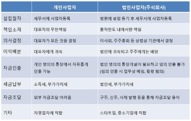 카페나 식당 같은 자영업을 하려면 개인사업자로 시작하는 것이 유리한 점이 많을 수 있고 장사가 아닌 사업을 하고자 한다면 법인사업자로 시작하는 것을 추천한다. 특히 스타트업을 설립한다면 무조건 법인사업자, 그중에서도 주식회사로 설립해야 한다. 추후 엔젤 투자자나 벤처캐피털 등의 외부 투자를 받기 위해서는 신주를 발행하거나 구주를 매각해 외부 자금을 유치해야 하기 때문이다. 심지어 정부 정책자금조차도 법인사업자에게만 해당하는 과제가 많기 때문에 주식회사로 설립해야 지원받을 수 있다. 개인사업자로 운영하다가 회사가 커지면 법인사업자로 전환하는 경우도 있지만, 회계처리도 복잡하고 대부분의 투자자들이 선호하지 않는다.