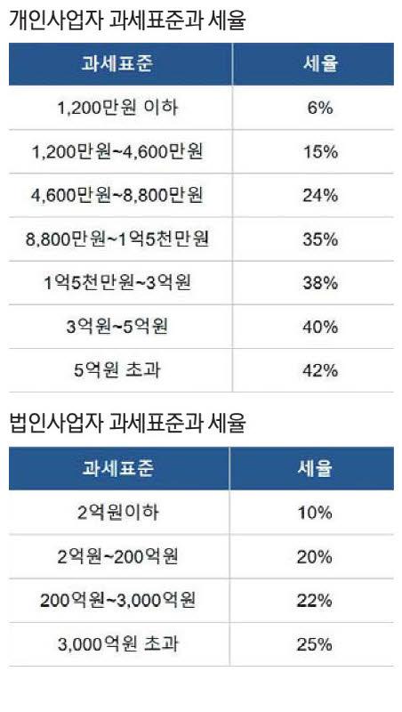 개인사업자와 법인사업자는 과세표준별 세율이 많이 다르다. 과세표준은 과세 당국에서 세금을 부과하는 기준이다. 간단하게 매출액에서 사업 운영에 필요한 경비를 뺀 순수익을 뜻한다고 생각하면 된다. 위의 표를 보면 개인사업자는 1200만 원 이하부터 5억 원 초과까지 총 7개 등급으로 나뉘어 있고, 법인사업자는 4개 등급으로 나뉜다. 단순하게 세율만 본다면 매출이 많을수록 법인사업자가 유리해 보일 수 있다. 하지만 법인사업자의 경우 사업주의 급여와 퇴직금을 비용으로 인정하기 때문에 그 금액에 따라 과세표준이 줄어들 수도 있다. 즉 세율의 유불리에만 기준을 두고 단순하게 개인인지 법인인지를 선택하는 것은 주의해야 한다.
