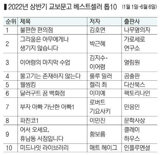 2022년 상반기 베스트셀러 1위는 김호연의 『불편한 편의점』이 차지했다. 숏폼 시대에 맞춰 연재형 스토리에 익숙해진 20~30대 독자들은 옴니버스 형식으로 주인공과 얽히고설킨 이야기에 매료됐다. 출간 초기에는 분야 순위에도 들지 못했지만 오디오북과 전자책으로 관심을 받다가 입소문이 나면서 봇물이 터졌다. 종합 10위권 판매 비중은 30대 독자(29.4%)가 주도하고 있다. 박지숙 기자