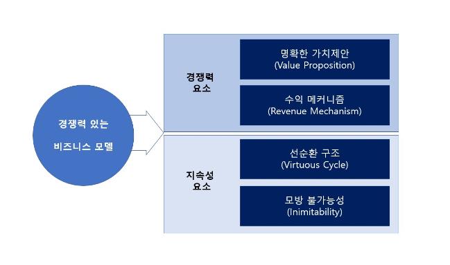 비즈니스 모델이 경쟁력을 갖추기 위해서는 경쟁력 요소(명확한 가치제안, 수익 메커니즘)와 지속성 요소(선순환 구조, 모방 불가능성)가 있어야 한다. 명확한 가치 제안은 공급자 마인드로 만든 제품이나 서비스를 말하는 것이 아니라 고객의 관점에서 문제를 해결하고 니즈(Needs)를 충족시킬 해결방안을 제공하는 것을 의미한다. 비즈니스 모델은 고객이 돈을 쓰고 싶을 만큼 충분한 가치를 제공할 수 있어야 한다. 수익 메커니즘은 고객가치를 창출했다면 그 가치들에 대해 효과적으로 기업의 수익과 연결하는 구조를 만들어야 한다는 것이다. 기업이 비즈니스로 수입을 발생시키고, 이윤을 내며, 투자자본에 대해 높은 수익을 내도록 하는 방법이다. 이윤을 통해 투자자본을 발생시키고, 다른 투자 대안들보다 더 높은 수익을 내야 성공적인 기업이 될 수 있다.