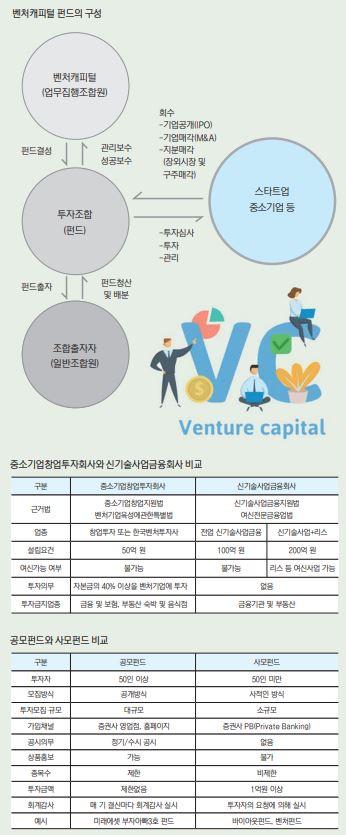 벤처캐피털은 크게 중소기업창업투자회사(이하 창투사)와 신기술사업금융회사(이하 신기사)로 이원화돼 있다. 창투사는 중소기업창업지원법에 의거해 창업을 준비 중이거나 기술력은 뛰어나지만 자본력이 미약한 중소기업에 납입자본금의 50% 범위 내에서 직접 투자하는 투자회사다.