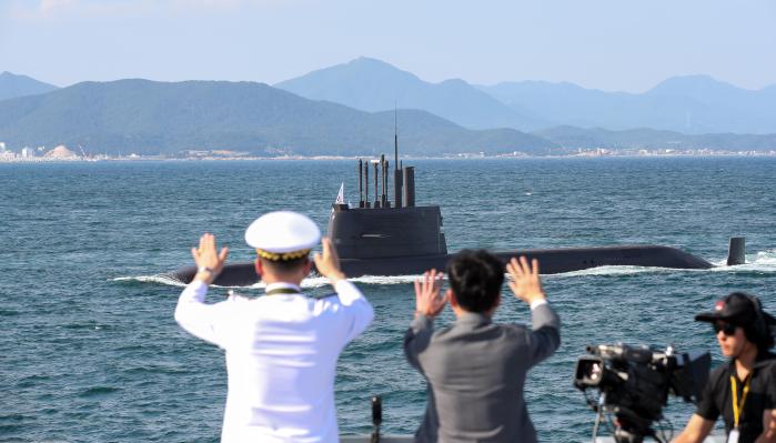 이어선 잠수함이 등장했다. 1200톤급 박위함, 1800톤급 이범석함, 우리나라 독자 기술로 건조된 3000톤급 잠수함 3번함인 신채호함이 순서대로 항해했다.