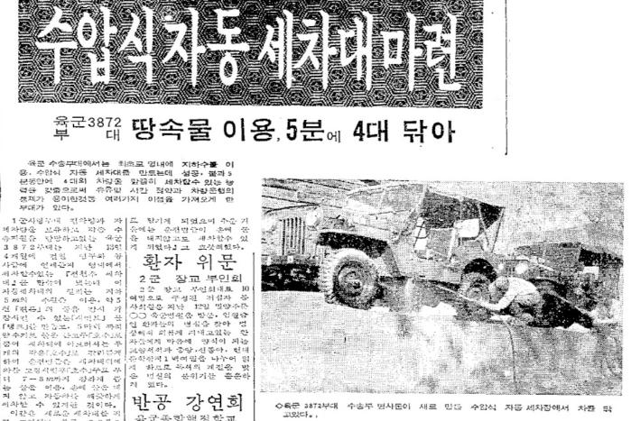 기사는 “육군 수송부대에서는 최초로 영내에 지하수를 이용, 수압식 자동세차대를 만드는 데 성공해 불과 5분 동안 4대의 차량을 말끔히 세차할 수 있는 능력을 갖춤으로써 유류 및 시간 절약과 차량 운행의 통제가 용이한 것 등 여러 가지 이점을 가져오게 한 부대가 있다”는 전문으로 시작합니다.