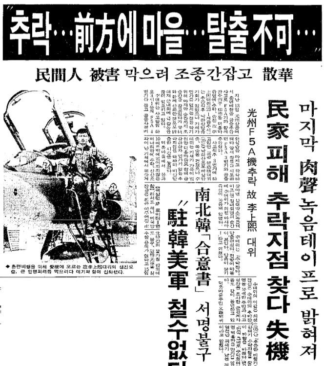 기체는 덕흥마을에서 불과 10여 m밖에 떨어지지 않은 미나리밭에 추락했습니다. 뒤늦게 찾아낸 블랙박스엔 절체절명의 순간 이 대위가 외친 마지막 육성이 녹음돼 있었습니다. 기사는 “추락한다, 탈출하겠다. 전방에 마을이 보인다. 탈출이 불가…”라고 전하고 있습니다.