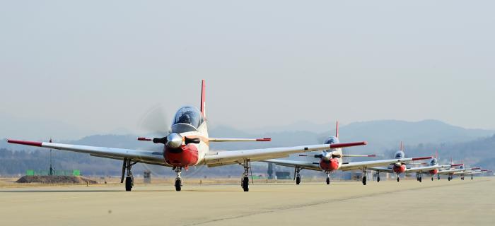 7일 공군3훈련비행단에서 2026-1차 비행교육 기본과정을 이수 중인 학생조종사들이 첫 단독비행에 나서기 위해 KT-1 항공기를 타고 활주로로 이동하고 있다. 이날 홀로 출격한 학생조종사들은 지난해 8월 기본과정에 입과해 항공기 조종에 필수적인 지식을 습득했고, 교관 조종사와의 동승비행 훈련으로 비행 역량을 키웠다. 사진 제공=전미화 상사