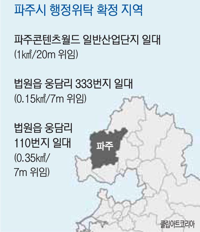 이번에 확정된 행정위탁지역은 △파주콘텐츠월드 일반산업단지 일대(1㎢/20m 위임) △법원읍 웅담리 333번지 일대(0.15㎢/7m 위임) △법원읍 웅담리 110번지 일대(0.35㎢/7m 위임)다.