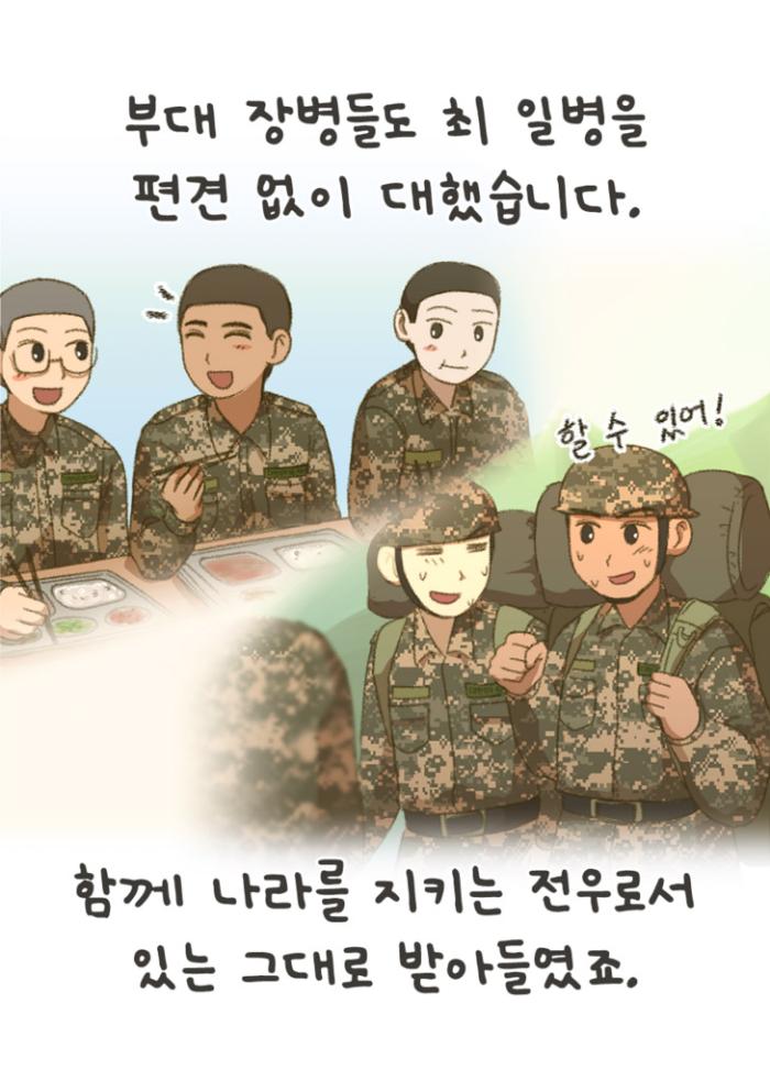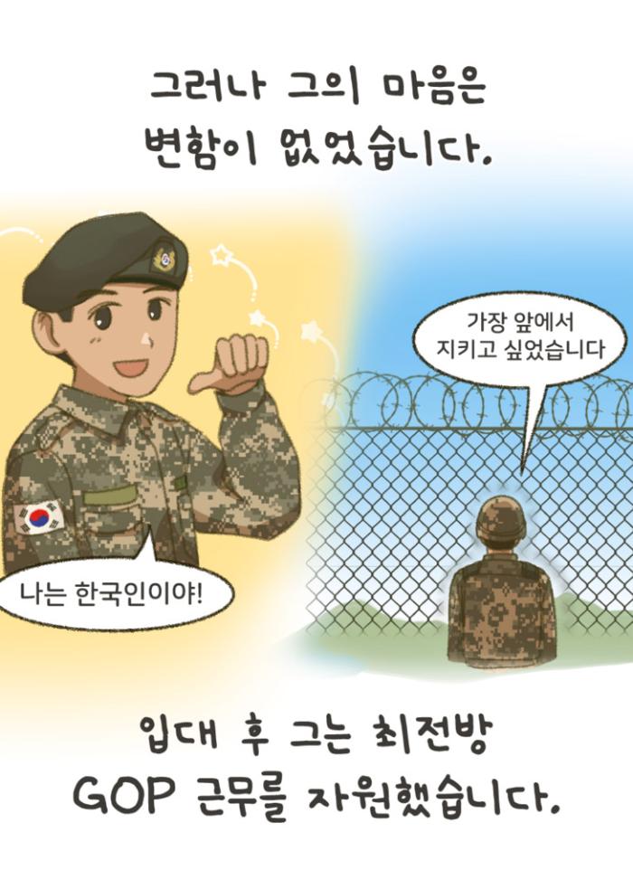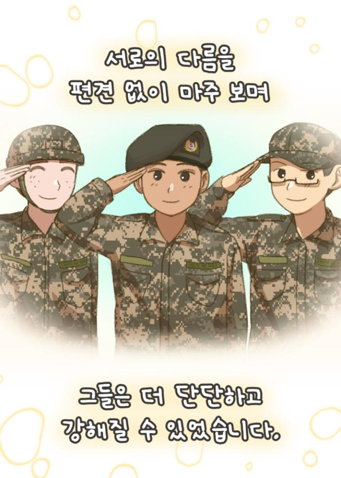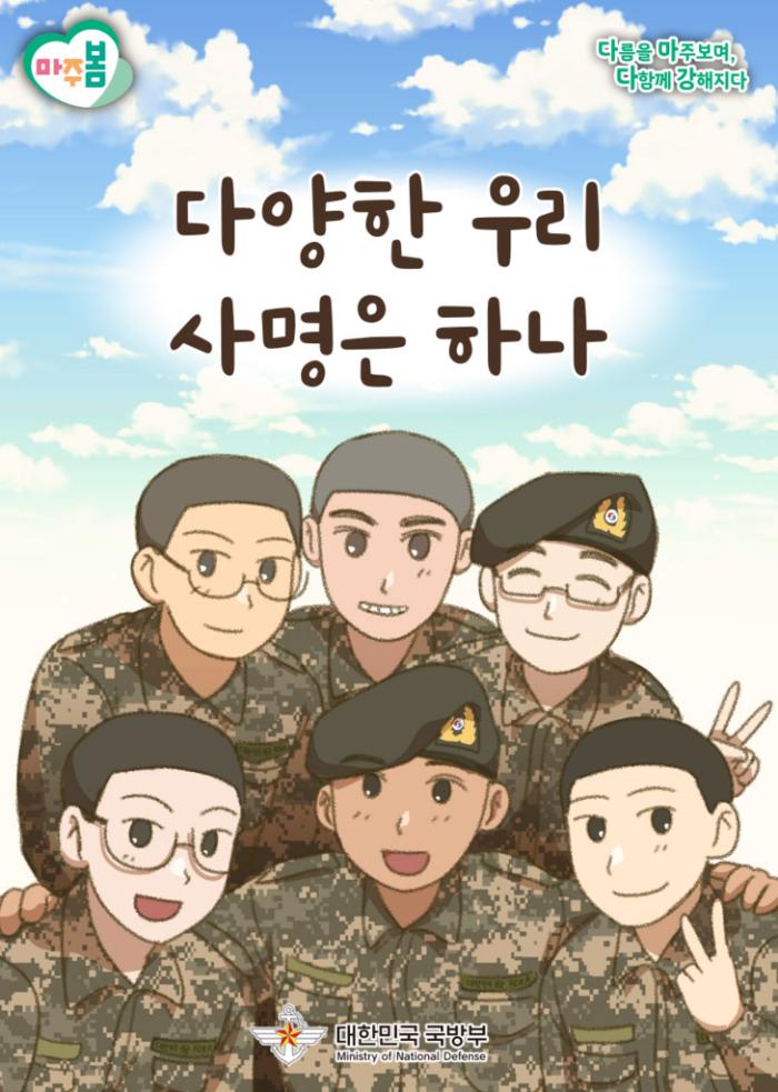 ‘마주봄’은 전 장병의 다문화 수용성 및 다양성의 이해를 높이고자 국방부 병영문화혁신담당관실과 국방일보가 공동 기획·제작한 교육 콘텐츠입니다. 차별과 편견의 벽을 넘어 서로의 다름을 이해하고 배려하는 병영문화는 우리 국군을 더 강하고 단단하게 만들어 줍니다. 장병 여러분 한 명 한 명의 작은 관심과 노력이 모이면 반드시 큰 변화를 만들 수 있습니다. 지금 이 글을 읽는 당신이 바로 ‘마주봄’의 주인공입니다. 국방부 병영문화혁신담당관실×국방일보 공동 기획·제작