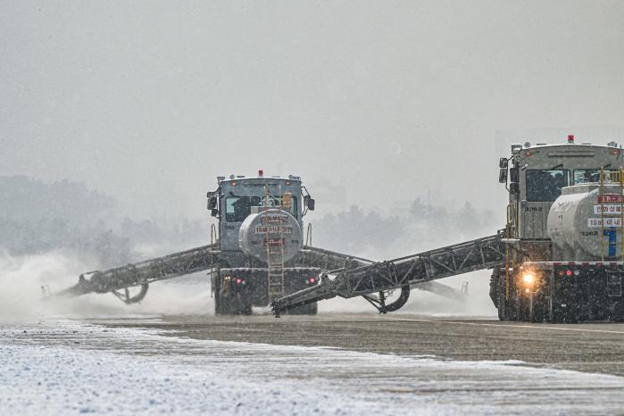 밤사이 전국에 내린 대설주의보가 2일 오전 해제된 가운데 공군11전투비행단 공병대대가 SE-88 등을 활용해 활주로 제설작업을 하고 있다. 각 공군비행단은 동계가 시작되는 11월 중순부터 선제적으로 제설작전 통제본부를 가동, 눈이 내리면 즉각 제설작전을 펼친다. 특히 퇴역한 F-4 팬텀(J79 엔진), F-5(J85 엔진) 엔진을 장착해 만든 SE-88을 이용해 엔진에서 뿜어져 나오는 400~500도의 열기로 활주로의 눈을 순식간에 녹인다. 사진 제공=정수진 하사