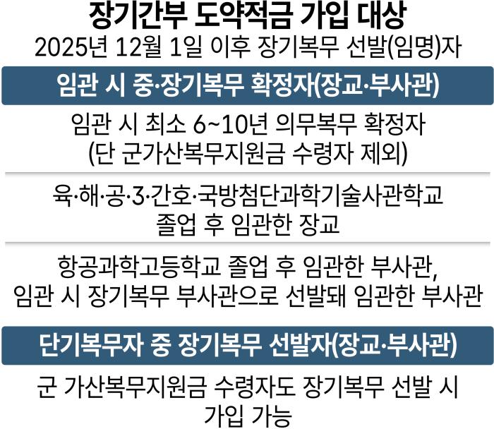 대상은 2025년 12월 1일 이후 장기복무에 선발된 장교·부사관이며, 다음 달 3일부터 가입할 수 있다.