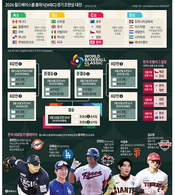 류지현 감독이 지휘하는 한국은 5일 체코와 1차전으로 WBC 조별리그 경기를 시작한다. 7일 일본, 8일 대만, 9일 호주와도 차례로 맞붙어 조 2위 안에 들어야 8강 토너먼트가 열리는 미국 마이애미로 갈 수 있다. 한국은 WBC에서 2006년 3위, 2009년 준우승으로 선전했으나 이후 세 차례 대회에서는 모두 조별리그 문턱을 넘지 못했다.