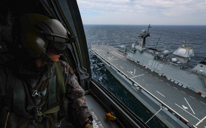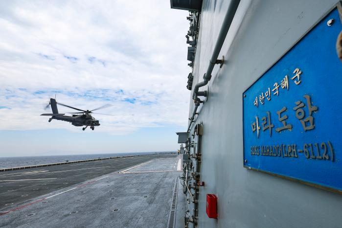 현장에서 훈련을 지휘한 박성진(대령) 마라도함장은 “이번 훈련을 통해 육상과는 다른 해상에서의 헬기 이·착함 절차를 숙달함으로써 어떤 상황에서도 임무 수행이 가능할 것”이라며 “반복적인 합동훈련으로 육상과 해상을 잇는 입체적인 작전 수행 능력을 유지할 수 있도록 적극 지원하겠다”고 말했다.