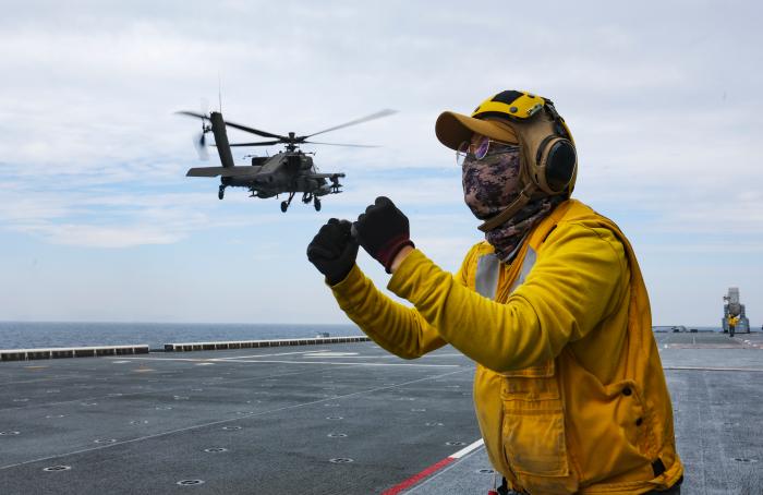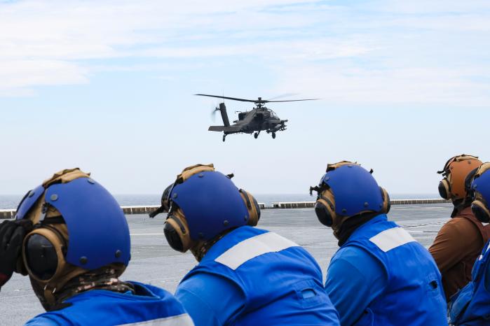 이날 비행갑판에서는 1번 스폿에 아파치, 3번 스폿에 블랙호크, 5번 스폿에 시누크가 이·착함했다.