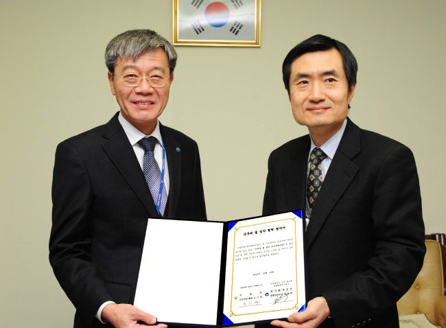 오기영(오른쪽) 국방부 군사시설기획관과 김시현 한국환경공단 물환경본부장이 지난 14일 국방부에서 군부대 물절약 협 |