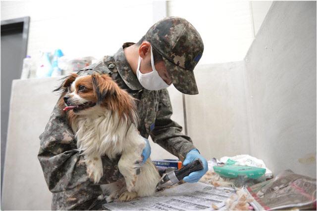 이날 군견소대 장병 10여 명은 약 400마리의 유기견들을 위해 견사장 청소, 목욕, 털깎기, 운동 등 다양한 봉사를 펼쳤다.