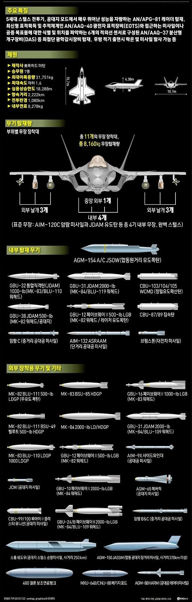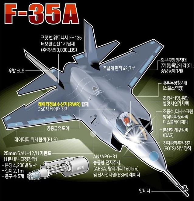 대한민국 공군의 힘을 한층 배가시켜줄 F-35A 전투기 2대가 지난달 29일 오후 2시 청주 공군기지에 도착했다. F-35A 전투기는 레이더에 탐지되지 않는 스텔스 기능을 보유, 예측할 수 없는 상황에서 적진을 타격할 수 있어 적에게는 악몽과 같은 무기로 꼽힌다. 주요 특장점을 그래픽으로 살펴보았다.