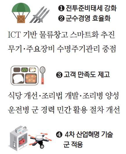 특히 올해는 국방개혁 2.0 기본계획에서 채택된 ‘자원제약 극복과 미래 전장환경 적응을 위한 4차 산업혁명 시대의 과학기술 적극 활용’이라는 기조를 구현하기 위해 △전투준비태세 강화 △군수경영 효율화 △고객(장병·국민) 만족도 제고 △4차 산업혁명 기술의 군 적용 등 4대 분야의 18개 중점과제를 발굴해 ‘군수혁신’의 또 다른 도약을 향해 박차를 가하고 있다.