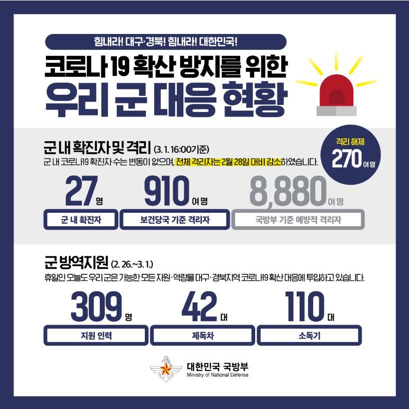 [코로나19] 우리 군 대응 현황 (03.1. 16시 기준)