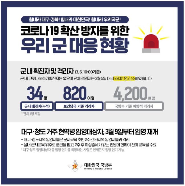 [코로나19] 우리 군 대응 현황 (3월6일 10시 기준)