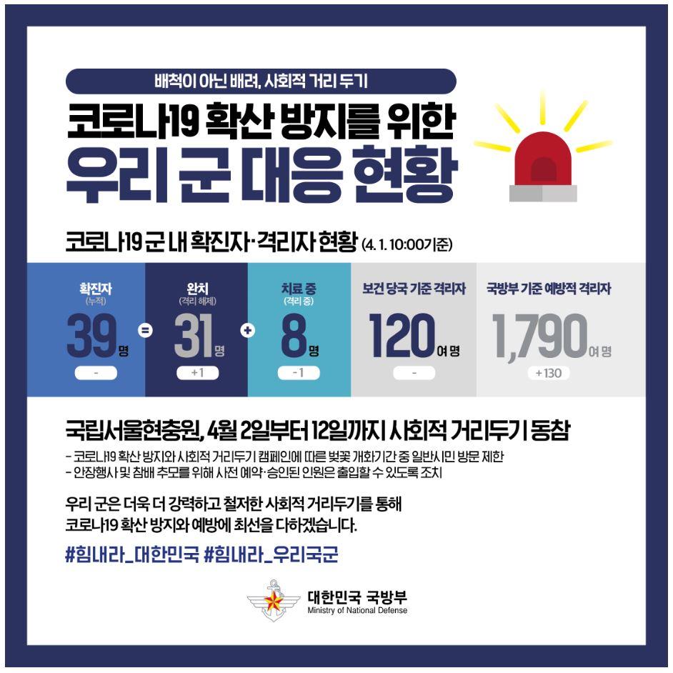 [코로나19] 우리 군 대응 현황 (4월 1일 10시 기준)