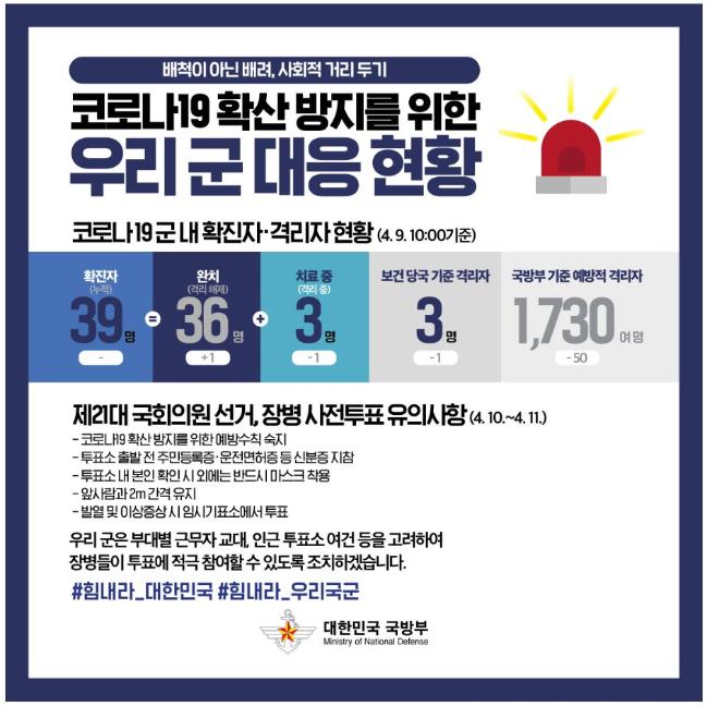 [코로나19] 우리 군 대응 현황 (4월 9일 10시 기준)