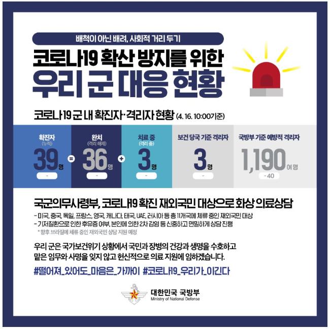 [코로나19] 우리 군 대응 현황 (4월 16일 10시 기준)