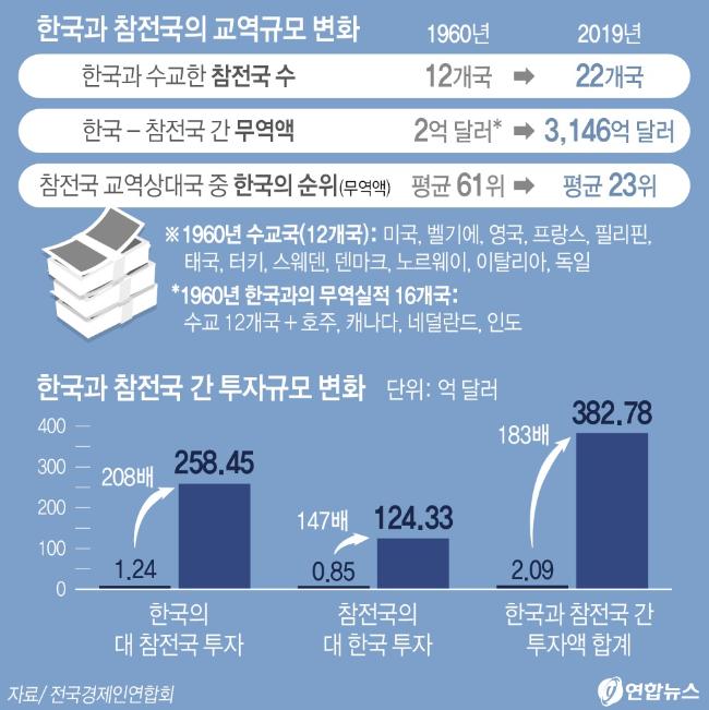 참전국의 교역상대국 중 한국의 순위(무역액 기준)는 1960년 평균 61위에서 작년 평균 23위로 뛰어올랐고 경제교류가 증가하며 한국과 참전국 간 오간 총 투자액의 합은 40년간 183배 증가했다. 연합뉴스