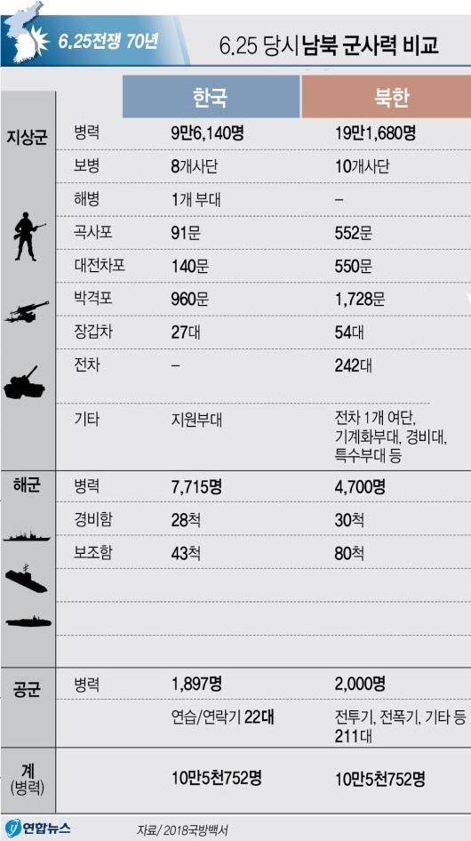 25일로 북한이 대한민국을 불법 침략한 지 꼭 70년이 되었다. 1950년 6월 25일 당시 남북의 군사력 비교.