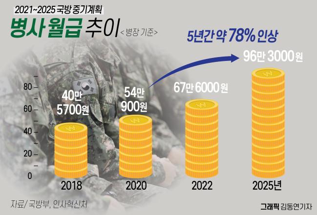 올해(54만900원)와 비교하면 5년간 78% 정도 오르는 것으로, 2022년 67만6000원, 2023년 72만6000원(하사 월 봉급의 40%), 2024년 84만1000원(하사 월 봉급의 45%)을 받게 된다. 디지털기획팀