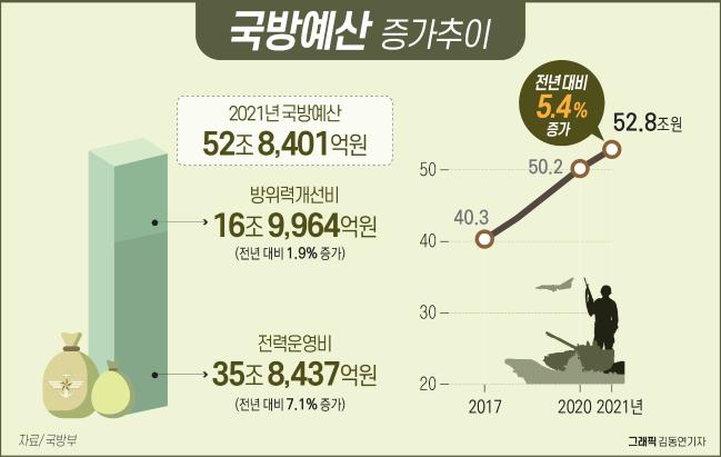 2021년도 국방예산이 올해보다 5.4% 늘어난 52조 8,401억 원으로 확정됐다. 국회는 2일 본회의에서 내년 국방예산을 올해 50조 1,527억 원 보다 5.4%(2조 6,874억 원) 증가한 52조 8,401억 원으로 의결했다.