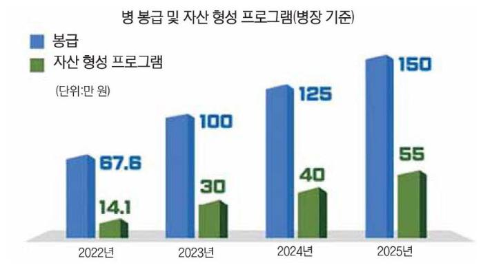 국방부는 ‘병역의무 이행에 대한 국가지원 강화’ 국정과제 이행을 위해 2025년까지 봉급과 자산형성프로그램을 결합해 병장 기준 월 200만 원 수준을 지원할 계획이다.