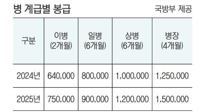 2025년 1월 입대하는 병의 봉급과 비교해도 다르지 않다. 이들은 18개월 근무 동안 총 2100만 원의 봉급과 개인 납입액에 따라 전역 시 최대 990만 원의 장병내일준비적금이 지급돼, 최대 3000만 원(월평균 167만 원)을 받는다.
