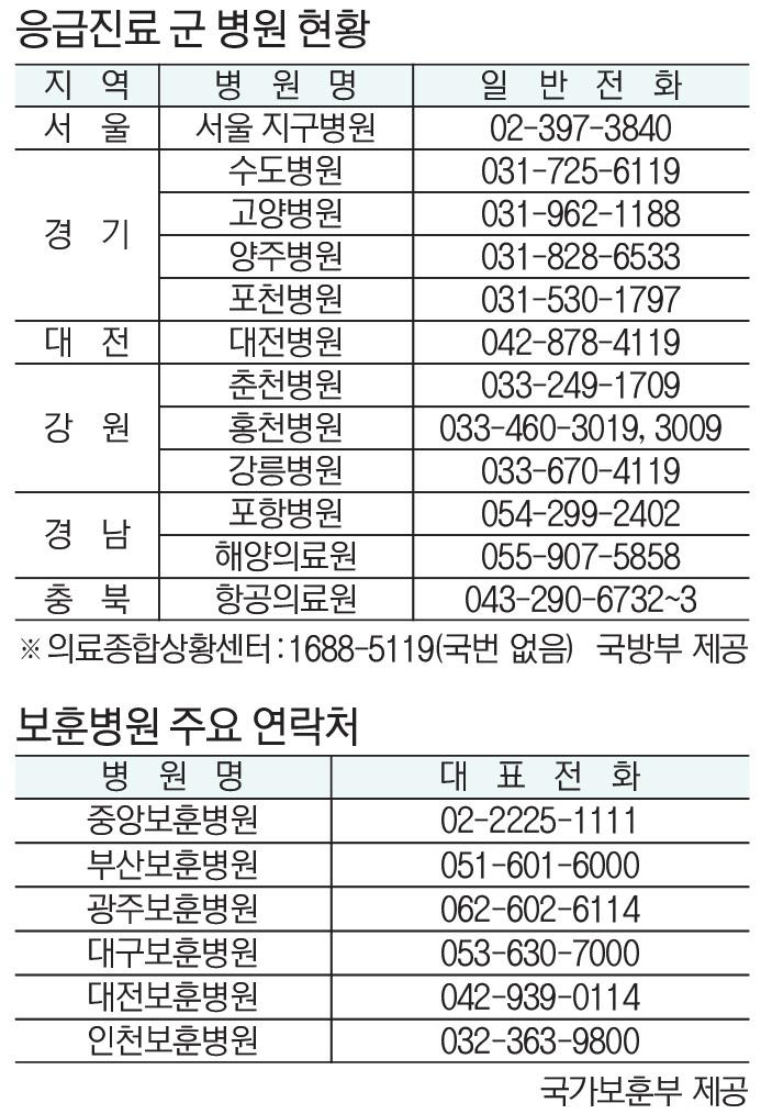 전국 12개 군 병원은 △서울지구병원(02-397-3840) △수도병원(031-725-6119) △고양병원(031-962-1188) △양주병원(031-828-6533) △포천병원(031-530-1797) △대전병원(042-878-4119) △춘천병원(033-249-1709) △홍천병원(033-460-3019) △강릉병원(033-670-4119) △포항병원(054-299-2402) △해양의료원(055-907-5858) △항공의료원(043-290-6732)이다. 의료종합상황센터 대표번호는 국번 없이 1688-5119다.
