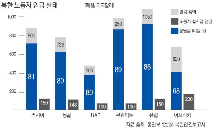 북한은 그동안 해외노동자 송출로 독재정권 유지를 위한 자금을 마련해왔다. 통일부가 발간한 북한인권보고서에 따르면 해외에 파견된 북한 인력은 하루 15시간이 넘는 중노동으로 혹사당하면서도 임금의 70~90%를 북한 정권에 착취당하고 있다.