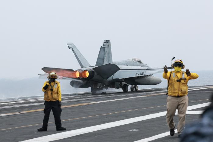 14일 제주 남방 공해상에서 이뤄진 한국·미국·일본의 다영역 3자훈련인 ‘24-2차 프리덤 에지 훈련’에서 F/A-18E 함재기가 미 핵추진 항공모함인 조지워싱턴함 갑판을 이륙하고 있다. 제주 남방=김병문 기자