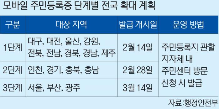 행안부는 지난해 12월 27일 세종특별자치시와 경기 고양시 등 9개 지방자치단체에서 모바일 주민등록증 시범 운영을 하고 있다. 여기에 오는 14일부터는 대구·대전·울산·강원·전남·전북·경남·경북·제주 등 9개 광역 지자체로 1단계 확대를 시행하기로 했다. 도시·농촌 등 주민센터별 다양한 업무 환경에서의 개선 사항 발굴 및 대응, 시범 발급 지자체의 노하우 활용 등을 위해 시범 발급 기초 지자체가 속한 광역 지자체가 1단계 확대 지역으로 선정됐다는 것이 행안부의 설명이다.