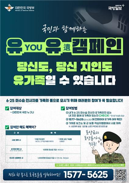 국방부가 호국보훈의 달을 앞두고 ‘6·25 전사자 유해발굴사업’의 국민적 공감대 확산을 위해 인공지능(AI) 기술로 제작한 ‘유(YOU)유(遺)캠페인’ 노래 5곡을 공개했다. ‘유유캠페인’은 전 국민을 대상으로 6·25 미수습 전사자의 신원 확인을 위한 유가족 유전자(DNA) 시료 채취 동참을 호소하는 캠페인이다. ‘당신(YOU)도, 당신의 지인도 유(遺)가족일 수 있다’는 의미를 담았다.