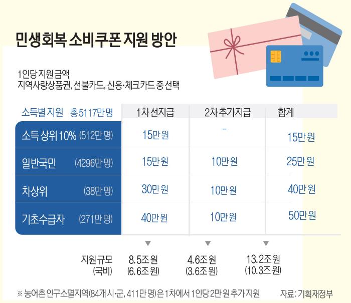 쿠폰은 빠른 소비 진작을 위해 두 차례 나눠 지급된다. 1차는 일반 국민 4808만 명에게 15만 원, 차상위계층 18만 명에게는 30만 원, 기초수급자 271만 명에게는 40만 원을 준다. 2차는 건강보험료 등을 기준으로 하위 90%에게 1인당 10만 원이 지급된다. 1·2차를 합하면 1인당 지급 쿠폰 액수는 △소득 상위 10%(512만 명) 15만 원 △일반 국민(4296만 명) 25만 원 △차상위 계층(38만 명) 40만 원 △기초수급자(271만 명) 50만 원이다. 여기에 84개 농어촌 인구소멸지역민에겐 1차 지급 때 2만 원이 추가돼 1인당 최대 지급액은 52만 원까지 오를 전망이다.