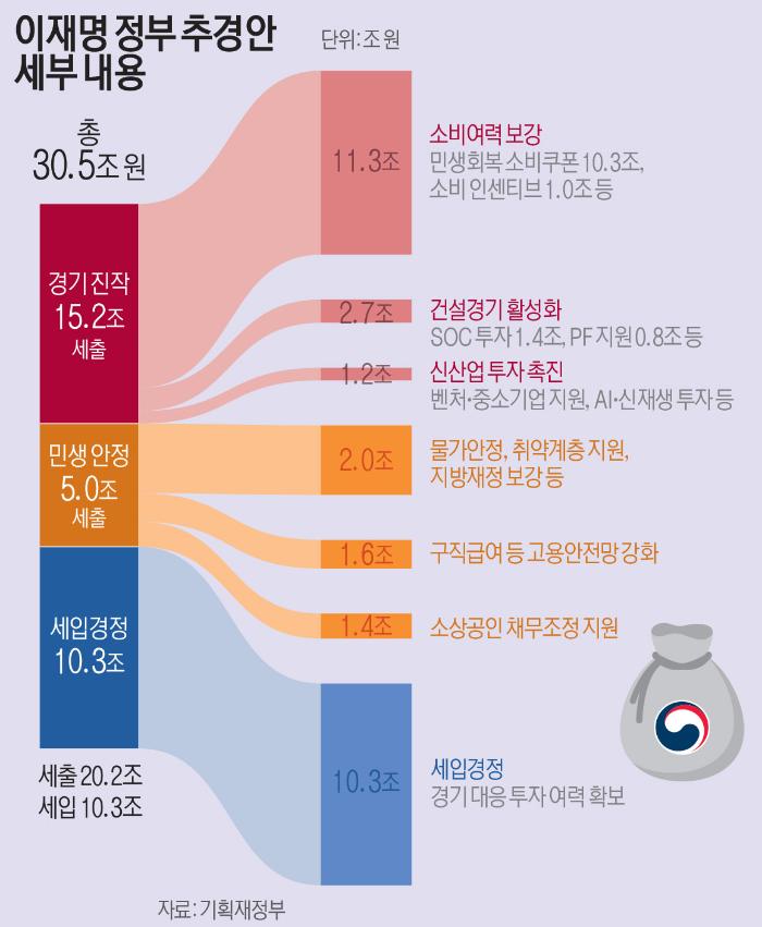 세출에서는 부문별로 소비 여력 보강과 건설경기 활성화 등 경기 진작에 15조2000억 원, 소상공인 재기 지원과 고용 안전망 강화 등 민생 안정에 5조 원이 투입된다. 맹수열 기자