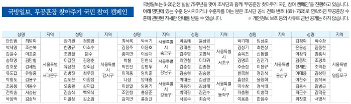 국방일보는 6·25전쟁 발발 75주년을 맞아 조사단과 함께 ‘무공훈장 찾아주기 국민 참여 캠페인’을 진행하고 있습니다. 아래 명단에 있는 수훈 당사자이거나 수훈자를 아는 분은 조사단 공식 전화 번호 1661-7625로 연락하면 무공훈장 수훈에 관련된 자세한 안내를 받을 수 있습니다. ※ 개인정보 보호 등의 사유로 군번 공개는 하지 않습니다.