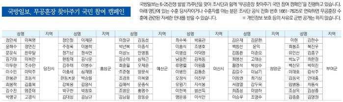 국방일보는 6·25전쟁 발발 75주년을 맞아 조사단과 함께 ‘무공훈장 찾아주기 국민 참여 캠페인’을 진행하고 있습니다. 아래 명단에 있는 수훈 당사자이거나 수훈자를 아는 분은 조사단 공식 전화 번호 1661-7625로 연락하면 무공훈장 수훈에 관련된 자세한 안내를 받을 수 있습니다. ※ 개인정보 보호 등의 사유로 군번 공개는 하지 않습니다.