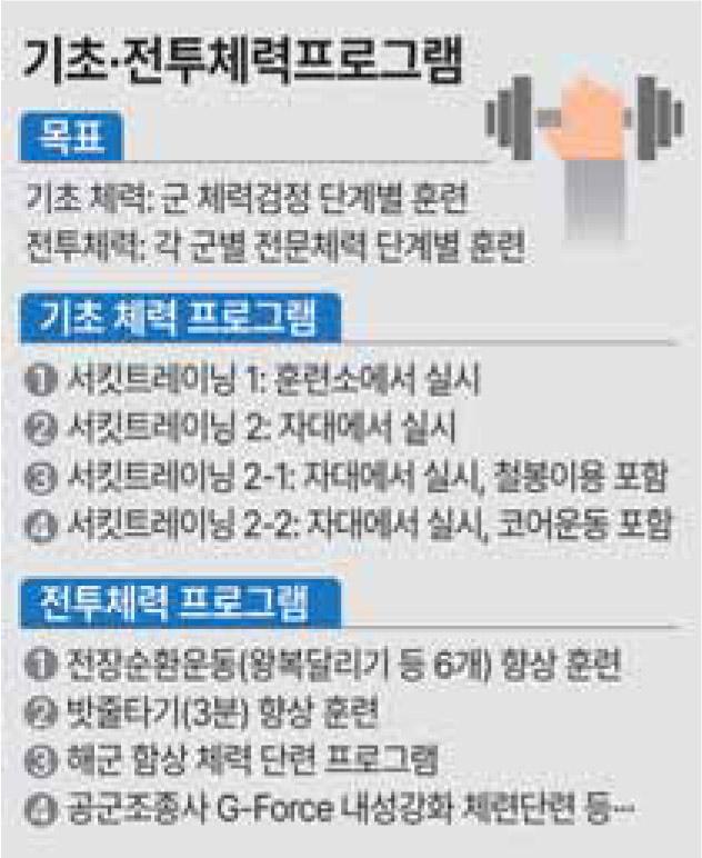 전투체력 프로그램은 각 군 세부 수요를 반영한 맞춤식 교육체계다. 현대전은 병과와 임무에 따라 요구되는 체력 조건이 다르기에 알맞은 체력단련 계획과 평가 체계를 갖춰야 해서다.