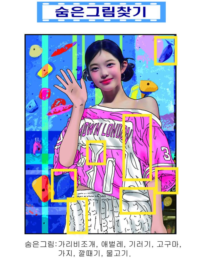 숨은 그림 : 가리비조개, 애벌레, 기러기, 고구마, 가지, 깔때기, 물고기
