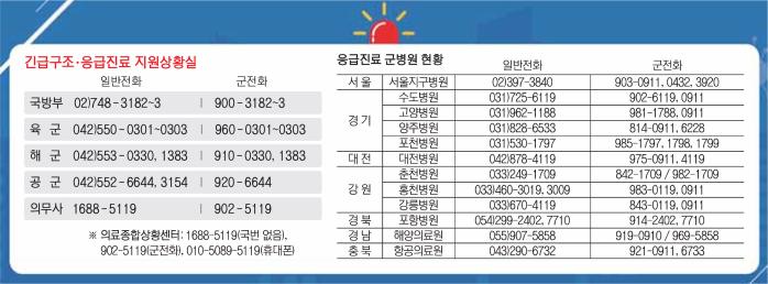 이에 따라 헬기·구급차·구난차 등 440여 대의 구조장비를 운용하고, 2700여 명의 의료·구조 지원장병이 지원태세를 빈틈없이 유지할 계획이다. 전국 12개 군병원은 24시간 응급진료를 지원하며, 도움이 필요한 국민은 언제든지 인근 군병원의 도움을 받을 수 있다.