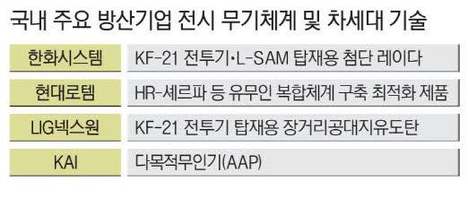 한화시스템은 KF-21 전투기에 탑재할 능동전자주사식위상배열(AESA) 레이다를 비롯해 장거리 지대공 유도무기(L-SAM) 등 첨단 레이다를, 현대로템은 다목적 무인차량 HR-셰르파 등 유·무인 복합체계(MUM-T) 구축에 최적화된 제품들을 내놓는다. 또 KAI는 다목적무인기(AAP)를, LIG넥스원은 KF-21 전투기에 탑재하기 위해 개발 중인 장거리공대지유도탄 등을 공개한다. 유럽·중동 시장에서 수출 성공을 거둔 K9 자주포와 K2 전차, 중거리 방공체계 천궁Ⅱ 발사대 등도 볼 수 있다.