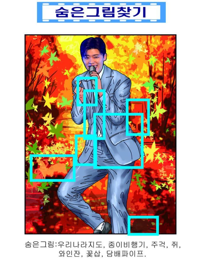 숨은 그림 : 우리나라 지도, 종이비행기, 주걱, 쥐, 와인잔, 꽃삽, 담배파이프