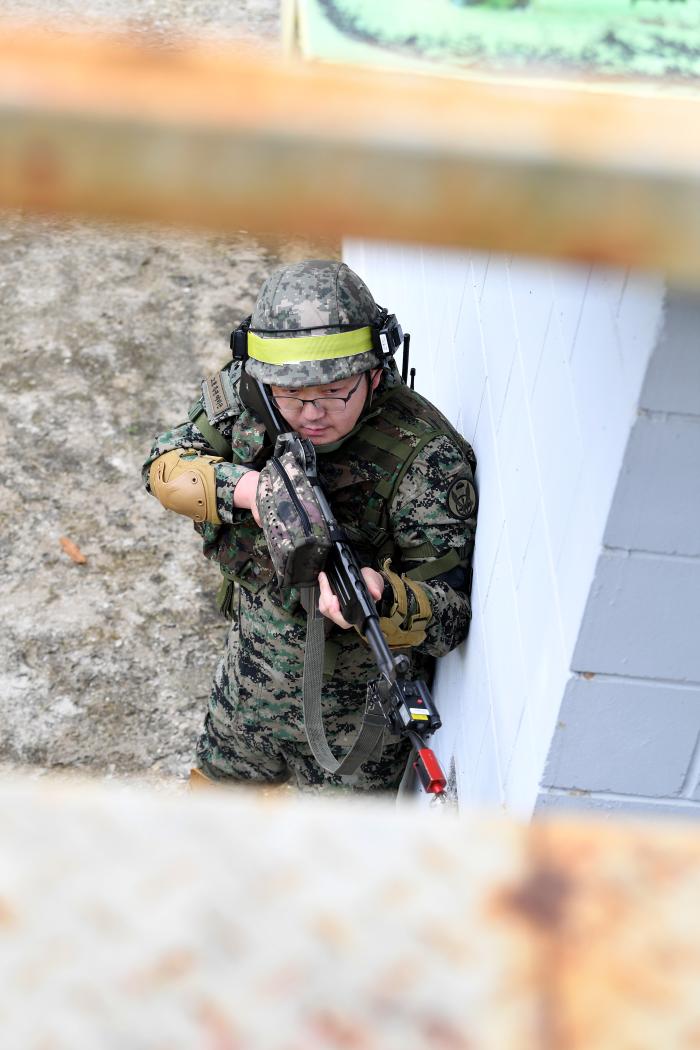 예비군들이 훈련장 외곽 산 능선을 타는 우회 기동까지 감행하며 후방에서 공격하자 정면에 있던 전투원들이 움직일 공간이 생겼다. 마일즈 장비로 ‘사망’ 판정을 받은 예비군이 아쉬운 표정으로 방탄헬멧을 벗고 훈련장을 빠져나가는 사이 다른 예비군이 탄알집을 회수하는 모습도 눈에 들어왔다. 현역 장병들도 건물을 뺏기지 않기 위해 건물 내부를 오가며 예비군들에게 총탄을 퍼부었다. ‘교전 종료’가 선언되기 전까지 살아남은 예비군과 현역 장병들은 상대를 제압하기 위해 비지땀을 흘렸다.