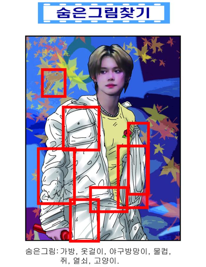 숨은 그림 : 가방, 옷걸이, 야구방망이, 물컵, 쥐, 열쇠, 고양이