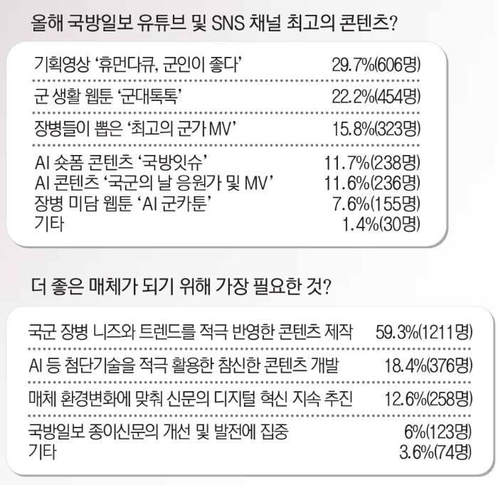 마지막으로 독자들에게 국방일보의 혁신 방향에 대한 의견을 구했다. ‘시대적 변화의 흐름에 맞춰 더 좋은 매체가 되기 위해 가장 필요한 것은?’이란 질문에 ‘국군 장병 니즈와 트렌드를 적극 반영한 콘텐츠 제작’이란 응답이 59.3%(1211명)로 가장 높게 나타났다.